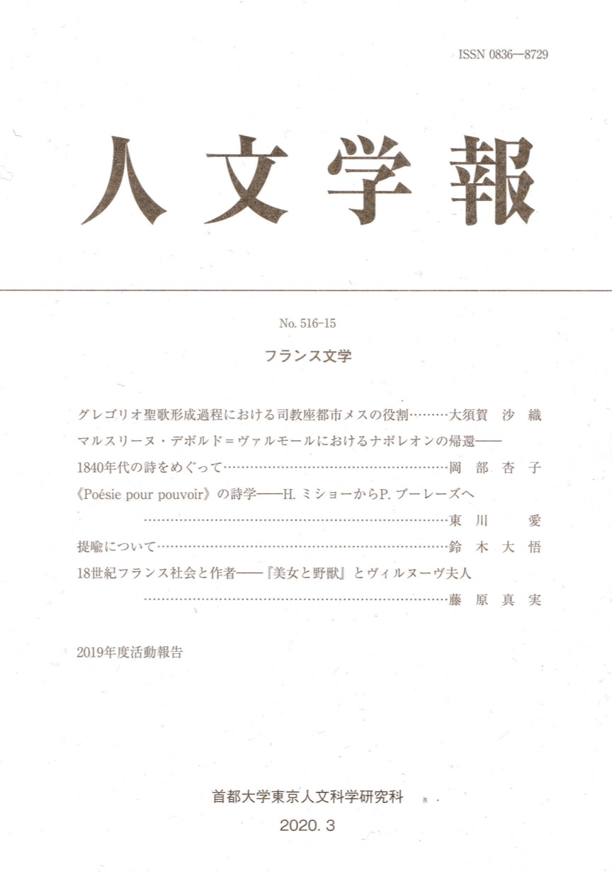 日本語の研究論文「《Poésie pour pouvoir》の詩学−−−−H. ミショーからP. ブーレーズへ」が『人文学報(フランス文学)』(第516-15号 首都大学東京人文科学研究科2020年3月)に掲載されました。ミショーの詩とブーレーズの音楽をつなぐ主な要素を整理した試論的な考察です。