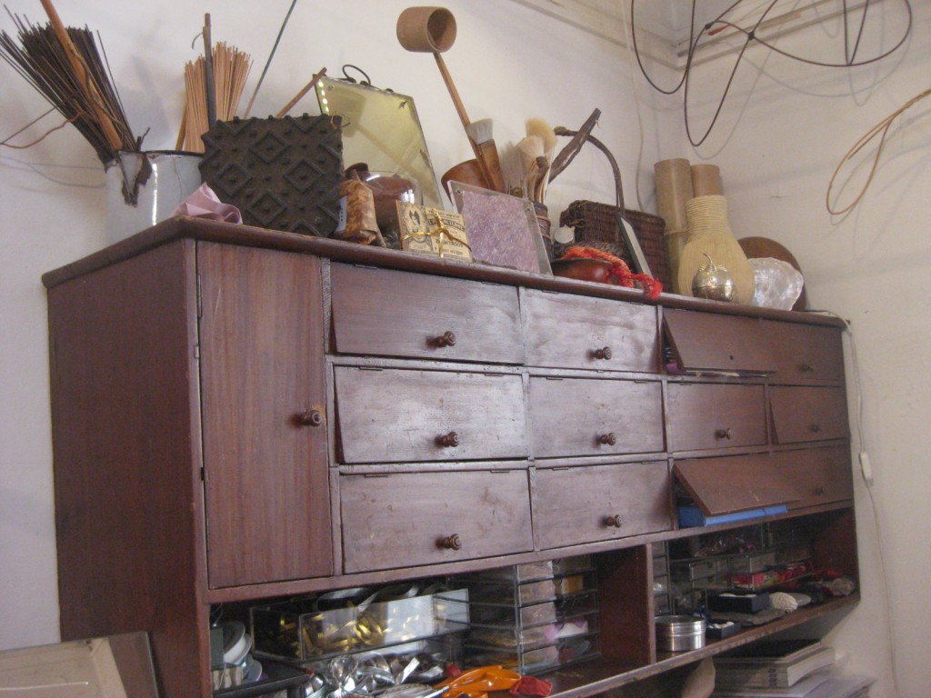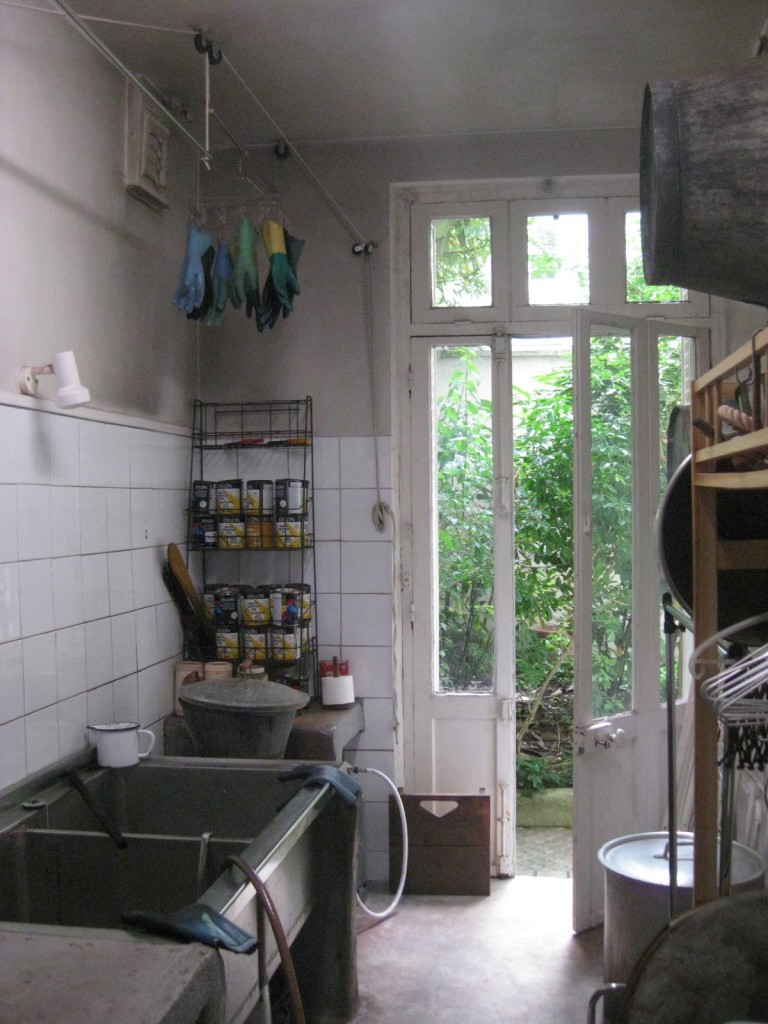 アトリエは日本式の一階にあって、パリには珍しく通りに面したドアから直接入ることができる。友人たちと一緒に約束して訪ねたのだけれど、どうやら私が一番乗りで、イザベルさんにアトリエを案内してもらう。サロン的な空間を通り抜けると、その先に作業場がある。中庭に通じる作業場は緑も見えて気持ちのいい空間。