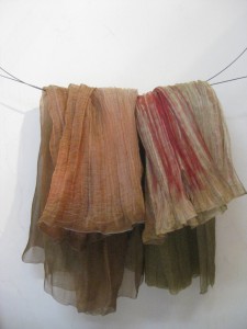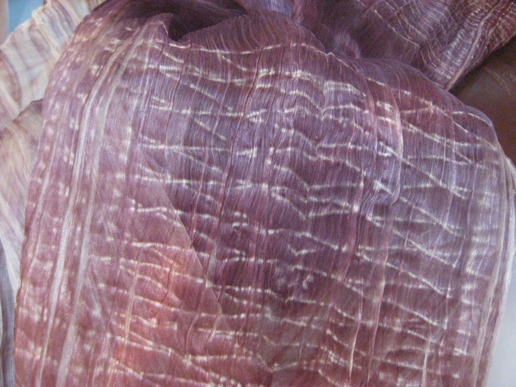 先日、パリの11区にあるイザベルさんのアトリエを友人たちと訪ねた。日本の染色技法である絞り染めをはじめ、インドやラオス、カンボジアなど東アジア、チュニジア、カナダなど世界各地を訪れて染色を学んだというイザベルさんは、まっさらな生地に染色を施して、ショールやアクセサリー小物など身につけるものから、演劇やオペラの舞台衣装、さらに空間全体を使ったオブジェや舞台装置まで、幅広い作品づくりを行っている。和田エミさんとの出会いも大きかったそう。イザベルさんのテキスタイルは、その素敵な色合いもさることながら、プリーツのような立体感のあるテクスチュアが魅力のひとつ。