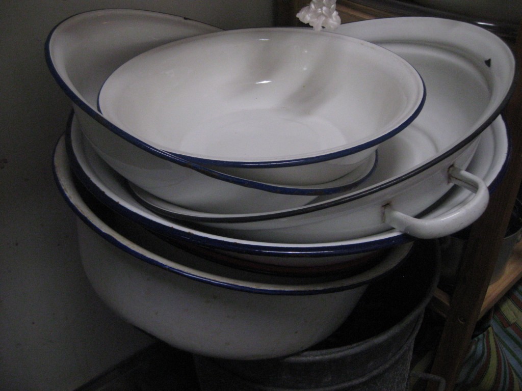 重ねられた琺瑯の桶がいいかんじ