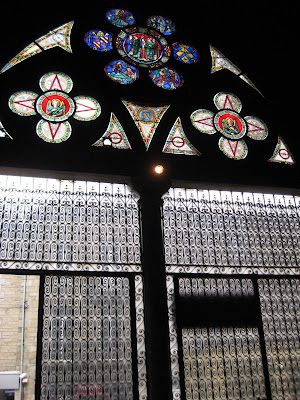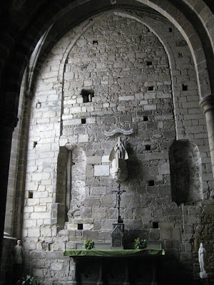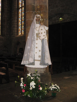 入口からすぐに黒マリア像 Vierge noireが見える。今回の旅は何の下調べもしていなかったけれど、レンヌのツーリスムでMisaさんと一緒に受け取ったコート・ダルモール県の地図を行きの電車で眺めていたら、ガンガンの教会に黒マリア像があると書いてあった。黒マリア像を見るのは今回が初めてではない。2003年3月に南仏をユーレールパスで周ったとき、クレルモン・フェラン、ル・ピュイ・アンヴレー、トゥールーズの教会で黒マリア像を見たのを覚えている。特に印象深かったのは、地下の礼拝堂の暗がりに置かれていたクレルモン・フェランの黒マリア像。黒いマリア像にまとわれた純白のヴェールが異様な光沢を放って、少しおどろおどろしいような雰囲気だった。そして今回また黒マリア像を見ることになるとは思わなかった。南仏に限らず地方の教会には黒マリア像があるのかもしれない。ガンガンで見た黒マリア像は、純白のヴェールに紺色の上衣を羽織っていた。思いのほかマリアの顔がぽちゃっとしていて親しみが湧く。マリアが抱いているイエスも可愛らしい。写真を撮りながらベンチに腰掛けて眺めていると、次々にガンガンに住むお年寄りが立ち寄って祈りを捧げていく。宗教的な信仰の意味もあるのだろうけれど、むしろ生活や日々の守り神としてマリア像が大切にされていることが窺えた。