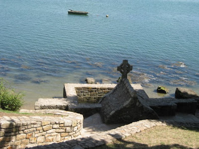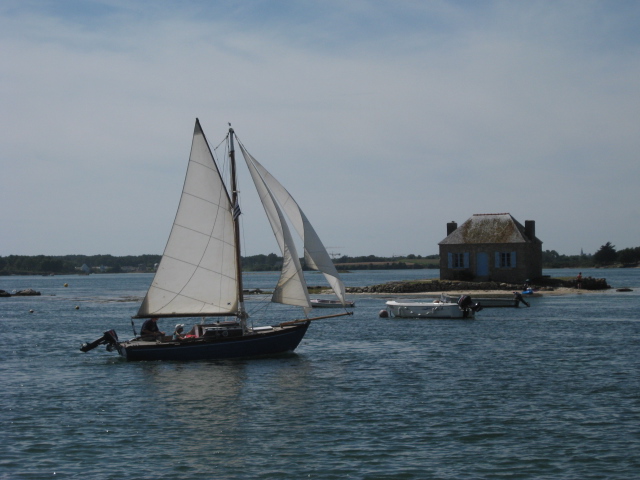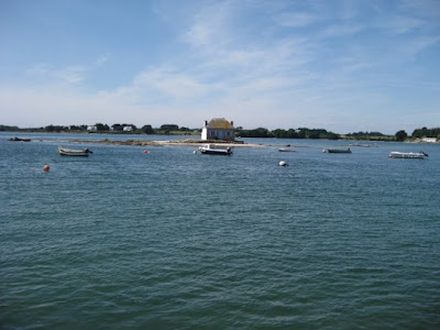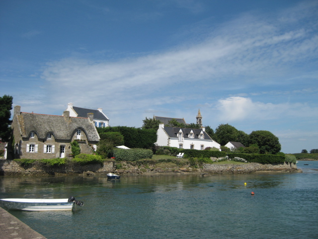 そんなこんなで、帰りの電車に乗るまであと4時間を残すばかり。さて、何をしよう!するとルーシーのお母さんが近くに小さな島々が点在する奇麗な場所があると言って、ルーシーと私を車で連れて行ってくれた。島々が点在するその一帯は、エテルという川がつくる小さな湾で、河口で海と川がつながっている。でも、写真を見てわかるように、どうみても日本の感覚でいう川には思えない夢のようなところだった。私たちは100メートルくらいの橋を渡って、この家の右側に浮かぶ小さな島サン・カド Saint-Cado島へ向かった。ここは5世紀から7世紀ごろにやってきた聖カドという人物がシャペルとフォンテーヌ、カルヴァリを建てたという伝説が残っている島だ。10分もあれば一周できるようなごく小さな島だったけれど、そこにある家々は趣があって素敵だった。
