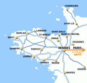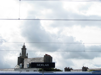 ブレストはブルターニュ半島の一番突端の街で、「地の果て」を意味するところ。私が降りた駅は、その一つ手前のモルレーMorlaixという駅。目的地だったカルナックに近いオーレイ Aurayの駅は、下の地図で見るとヴァンヌ Vannesの少し左にある。まったく反対の北側に来てしまった私。。ああ、やってしまった!と最初は思ったけれど、とりあえず駅員さんについていく。
